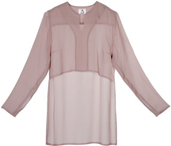 In preziosa georgette di seta la sua particolarità oltre che nel taglio, che slancia la silhouette di chi la indossa, sta anche nei dettagli discreti ma decisi, come l’apertura nell’interno manica e l’impuntura verticale che incornicia lo scollo.